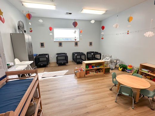 Our "Beluga" room is for children 6 weeks to 2 year. In the Beluga room we are developing our gross motor and fine motor skills. With these skills we can do things such as; climb, sit at the table, feed ourselves using utensils, and hold art tools. We are learning math concepts through patterning, comparison, sorting, and counting. Our baby Belugas are learning self-sufficiency and how to interact with other children in a social environment. The curriculum used in the Beluga room is; Kaplan's Learn Every Day and Beyond Centers and Circle Time.